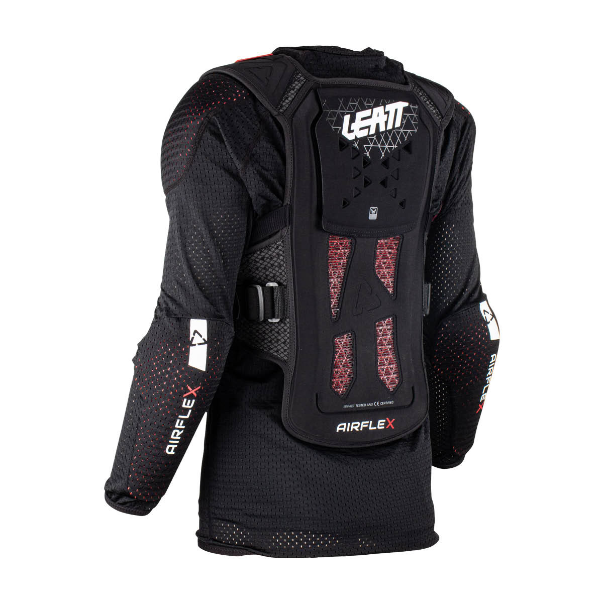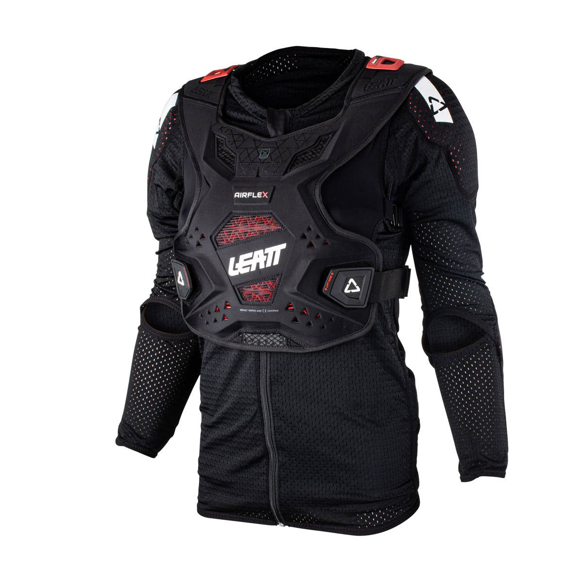 Das Leatt AirFlex Protektorhemd besteht aus zwei Teilen. Ein langärmliges Kompressionsshirt mit Reißverschluss und weichen Schulter und Ellbogenprotektoren, darüber wird ein Brust- und Rückenprotektor getragen, der über die Spitze geht. Zusätzlich gibt es noch einen Riemen, um sich an die weibliche Form anzupassen. Um optimalen Schutz, Komfort und eine gute Belüftung zu gewähren ist am Rücken ein AirFlex Soft Impact Gel und im Brustbereich I-Mesh. Das MoistureColl- und das AirMesh Material halten den Körper trocken und leiten Schweiß ab. Durch das BraceOn System kann ein NeckBrace integriert werden. Brustprotektor En1621-3 Level 1, Rückenprotektor EN1621-2 Level 1, Schulter und Ellbogen EN1621-1, gepolsterte Flanken.