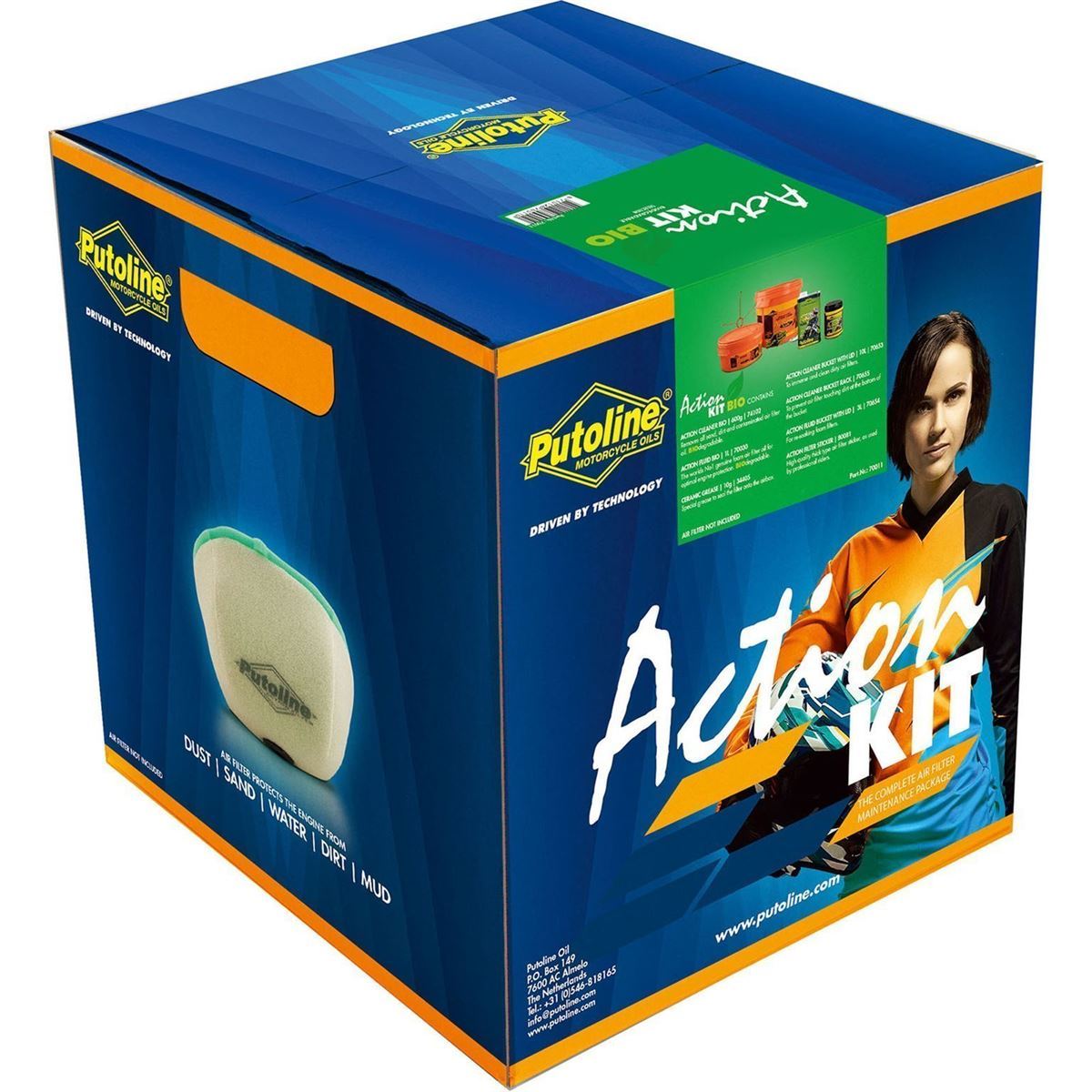 Reinigungs-Set bestehend aus: 1 Kübel/Deckel groß mit Gitter zur Filterreinigung, 1 Kübel/Deckel klein zur Filterimprägnierung, 1 Kanister Filterreiniger (4 Liter), 1 Liter Luftfilteröl Action Fluid, 1 Dose 65g White Grease Spezialfett, 1 Paar Einweghandschuhe, 1 Spezialaufkleber Action Fluid