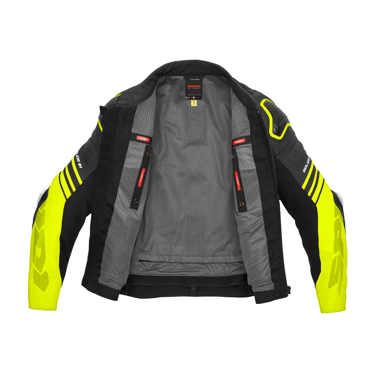 Die SPIDI Bolide ist eine Jacke mit externen Warrior Schilden an den Schultern und Ellbogen, herausnehmbaren internen Warrior Lite Protektoren (EN 1621-1 Level 1) in den Schultern und Force-Tech Protektoren (EN 1621-1:2012) zum Schutz für die Ellbogen.