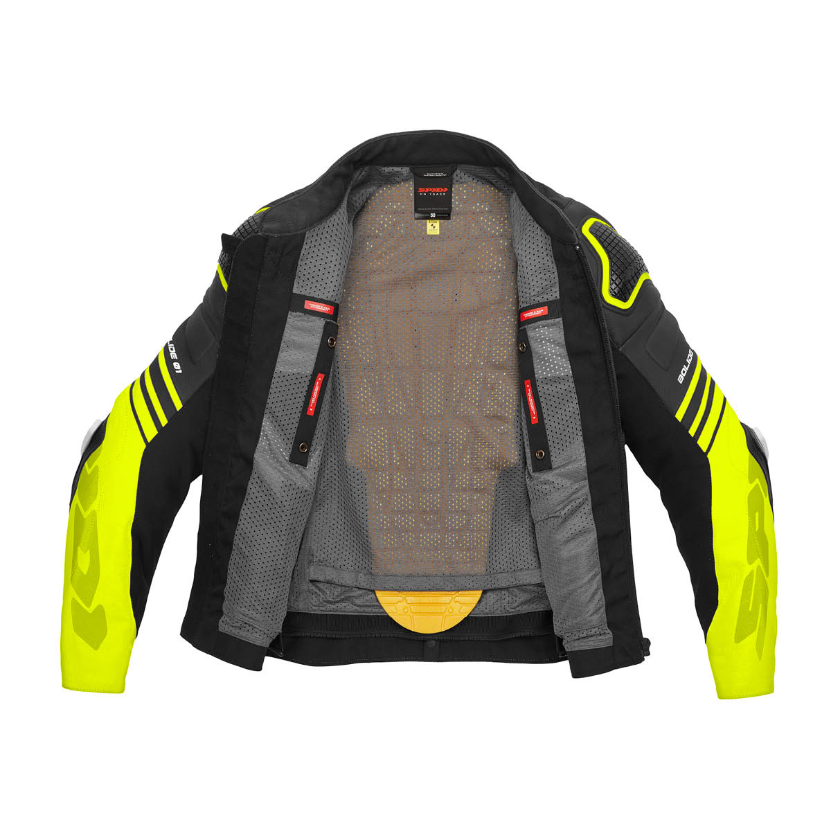 Für zusätzlichen Schutz gibt es eine interne Anordnung für entweder ein Level 1 oder 2 Warrior Rückenprotektor, und ein Warrior Brustprotektor, beide separat erhältlich. Das Hauptmaterial des Spidi Bolide ist 1,1 bis 1,2 mm dickes Rindsleder mit hochfesten, elastischen Flex Tenax Nylon 6.6-Flexabschnitten.