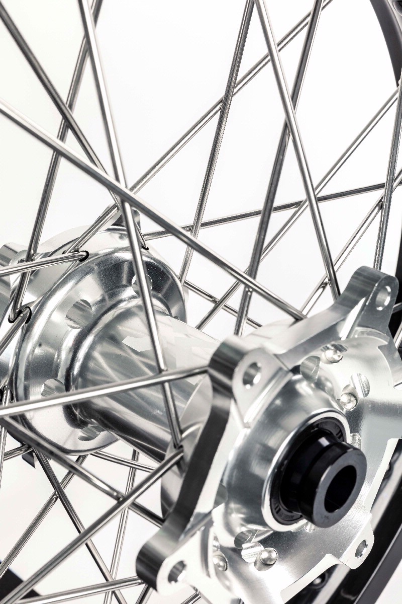 X-GRIP Felge ist mit extra dicken Speichen, hartanodisierten, schwarzen Felgenringen und Rad- Distanzhülsen ausgestattet. Dies sorgt für massive Strapazierfähigkeit. Beim Vorderrad sind zwei und beim Hinterrad drei Radlager verbaut.